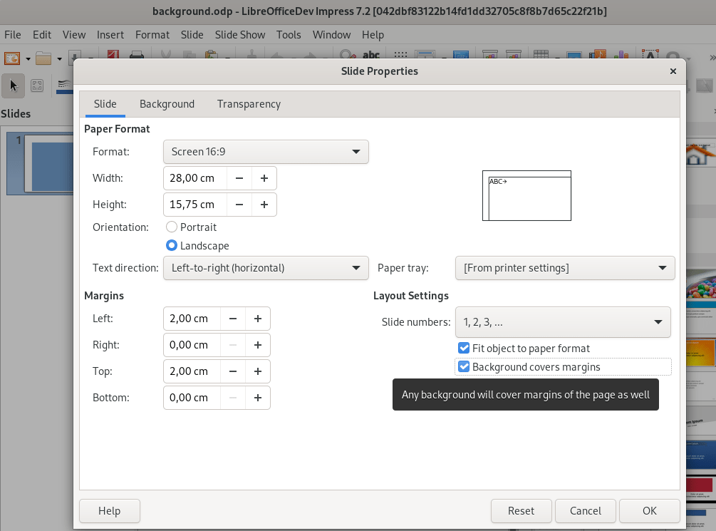- Impress: All background fills can now be set to either cover the page inside the margins or the entire page (https://git.libreoffice.org/core/commit/dda83832529fd8c7d02bdf14890faf84a3512112).