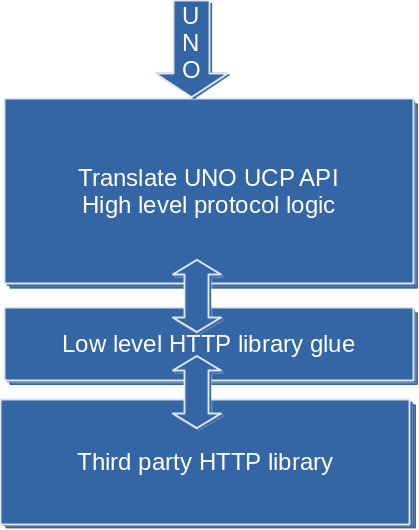 - Then there is the lower layer of the UCP, which translates the generic HTTP or WebDAV protocol calls to something that the particular third-party library can understand, hook up its callbacks for data transfer and authentication, and parse the reply XML documents.